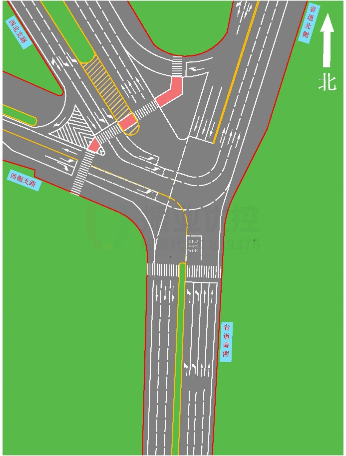 渠化方案:禁止北往西右轉(zhuǎn)方向車流,該車流需經(jīng)右轉(zhuǎn)渠化前往西北出口掉頭后右轉(zhuǎn),繞行進(jìn)入西出口;禁止西左轉(zhuǎn)往北出口方向車流,該車流需提前繞行;增加南進(jìn)口非機(jī)動車左轉(zhuǎn)待行區(qū),跟隨左轉(zhuǎn)機(jī)動車燈通行;增加西北進(jìn)口非機(jī)動車左轉(zhuǎn)待行區(qū);調(diào)整車道功能,增加相應(yīng)交通標(biāo)志。