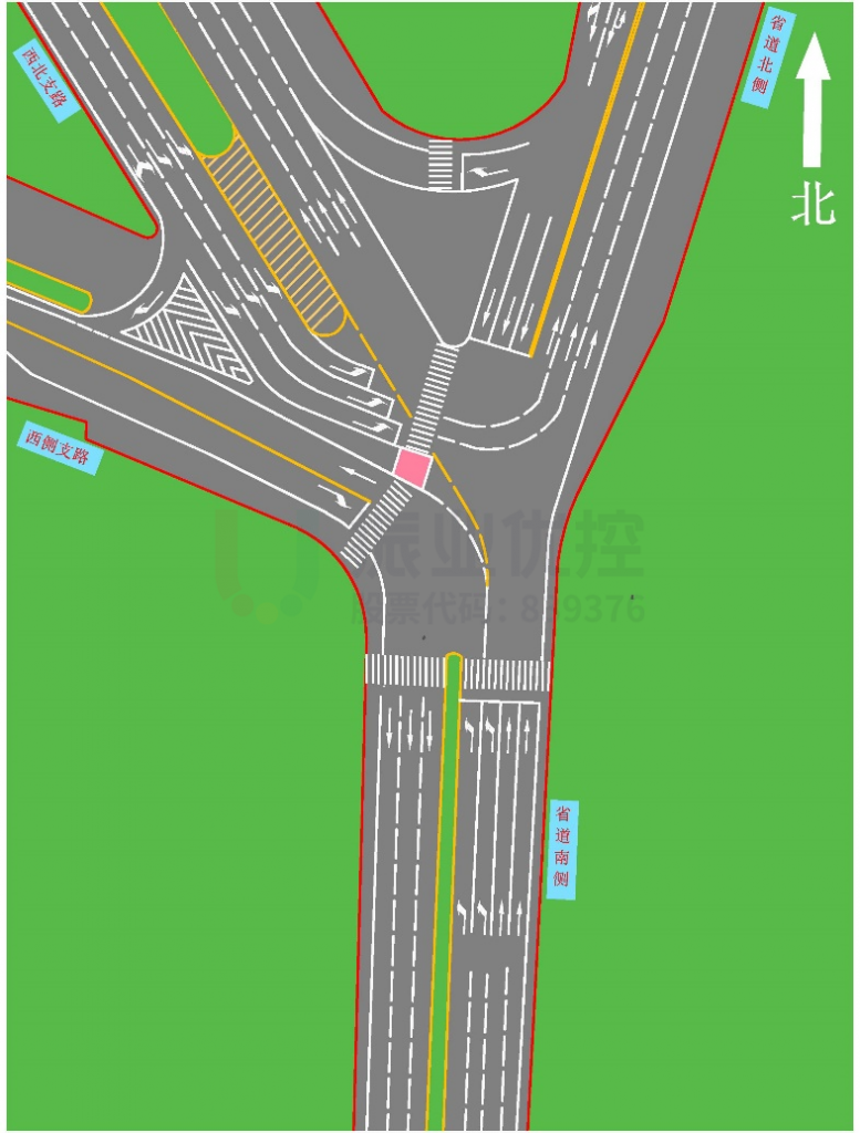 案例路口為某市高速出入口路口,南北向?yàn)槭〉?,往北進(jìn)入高速,往南返回市區(qū)。西向?yàn)橥ㄍ鞅毕虻姆种?,且由于西?cè)出口目前為施工占道狀態(tài),故西進(jìn)口占用一車道作為出口道使用。日常南北車流量、西北左轉(zhuǎn)往北車流量均較大,南往西北非機(jī)動車較多。