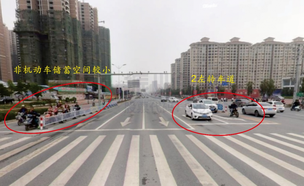 問題簡述:南北方向右轉(zhuǎn)機(jī)動(dòng)車通行需求大,在非機(jī)動(dòng)車較多時(shí),由于非機(jī)動(dòng)車道寬度較窄,路口排隊(duì)空間容易飽和,造成右轉(zhuǎn)機(jī)動(dòng)車無法通行;高峰時(shí)段南出口左轉(zhuǎn)機(jī)動(dòng)車通行需求大,由于只有一條左轉(zhuǎn)專用車道,部分車輛出現(xiàn)二次排隊(duì)的現(xiàn)象。