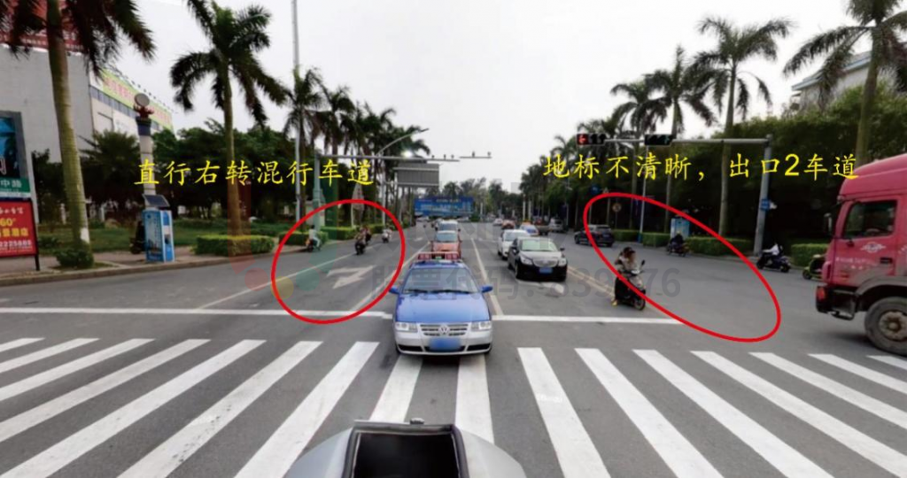 問題簡述:南進(jìn)口直行與右轉(zhuǎn)為混合車道,出現(xiàn)直行車輛阻擋右轉(zhuǎn)車輛現(xiàn)象,右轉(zhuǎn)車輛通行效率較低;南出口標(biāo)志、標(biāo)線不清晰,存在安全隱患。