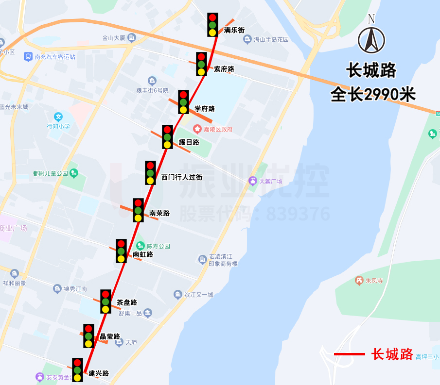 長城路是南充嘉陵主城區(qū)南北方向的主要干道之一,沿線分布著眾多學(xué)校(嘉陵南高、光彩實(shí)驗(yàn)小學(xué))、住宅區(qū)(泥溪口小區(qū)、源泉小區(qū)等)、市場商圈(光彩大市場、保利購物中心)、公園(陳壽公園)等主要交通吸引點(diǎn),道路日常承擔(dān)著巨大的通行壓力。路段全長2.9公里,共涉及10個(gè)信號(hào)燈路口,早晚高峰南北直行車流量較大。