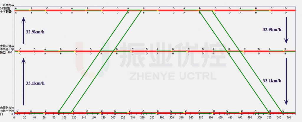 2.經(jīng)過(guò)分析計(jì)算,詩(shī)書路北段(裴城路至紅星西路)協(xié)調(diào)周期110秒,南段(環(huán)湖路至一環(huán)南路)協(xié)調(diào)周期115秒,均采用小周期控制,以下為綠波協(xié)調(diào)時(shí)距圖。
