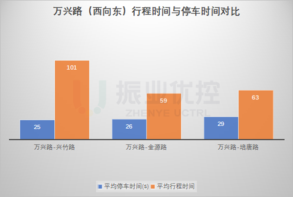 由于路段信號燈路口未進行協(xié)調(diào)控制,加上道路環(huán)境復(fù)雜,如萬興路-金源路路口西進口存在路段瓶頸(三車道變四車道)、行人橫穿馬路與非機動車隨意闖紅燈等現(xiàn)象頻發(fā),導致路段平均車速較慢。