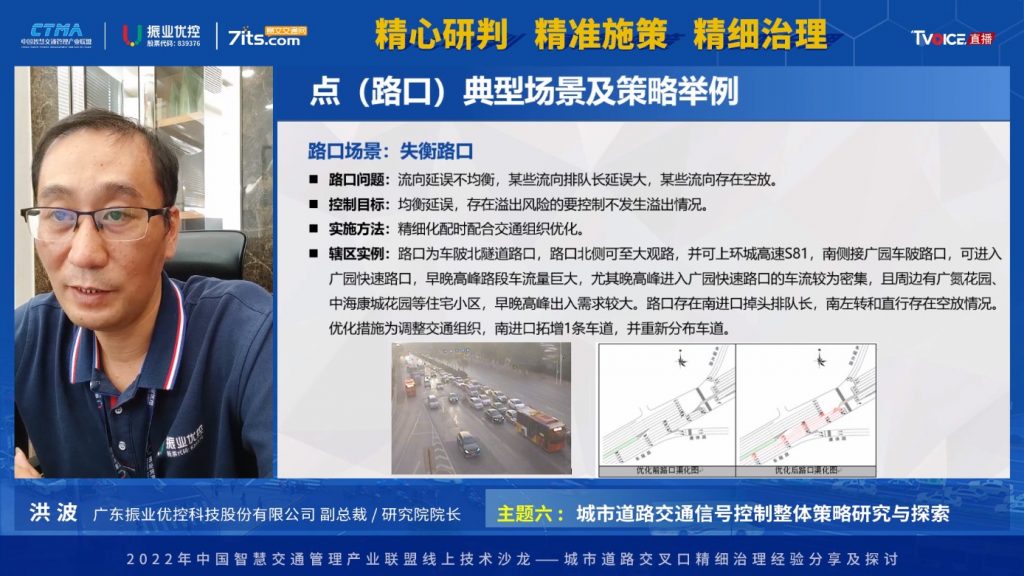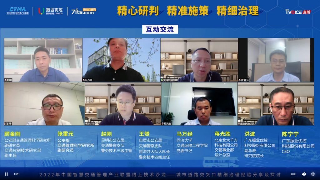 技術(shù)沙龍由振業(yè)優(yōu)控CEO陳寧寧博士擔任主持人,特邀交科所交通控制技術(shù)研究部主任/研究員邱紅桐致辭、交科所副研究員/交通控制技術(shù)研究部副主任顧金剛擔任互動嘉賓。同時還邀請了交科所副研究員張雷元、昆明市公安局交通警察支隊警務(wù)技術(shù)三級主管趙剛、自貢市公安局交通警察支隊自流井大隊大隊長/警務(wù)技術(shù)四級主任王赟、同濟大學(xué)交通運輸工程學(xué)院黨委書記馬萬經(jīng)、北京北大千方科技有限公司交管事業(yè)部設(shè)計總監(jiān)蔣光勝、振業(yè)優(yōu)控副總裁/研究院院長洪波,對“城市道路交叉口精細治理”這一課題進行深入探討,圍繞路口渠化設(shè)計、交通組織管理、交通控制策略、信號配時方案、行人過街優(yōu)化、交通控制策略、交通數(shù)字化治理等內(nèi)容展開深度討論,并與線上觀眾互動分享。