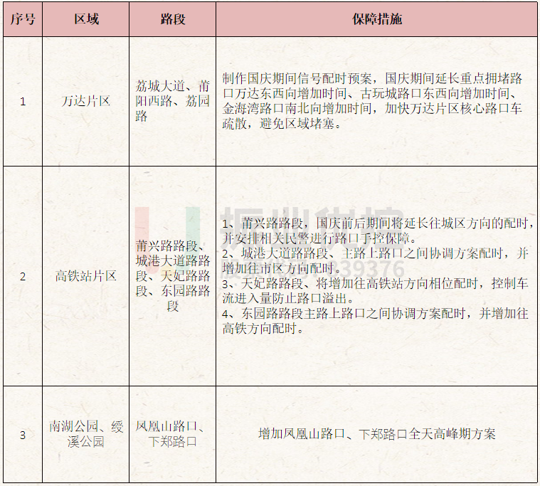 針對荔城大道、荔園路、東園路、東圳路、莆陽路、八二一大街、城港大道、學(xué)園路、勝利路、延壽路、天妃路等主干道,萬達(dá)片區(qū)、高鐵站片區(qū)、南湖公園綬溪公園等商圈和景區(qū)周邊,實(shí)施信號配時優(yōu)化預(yù)案,通過調(diào)整相位配時配合路面執(zhí)勤警力疏堵的措施,確保重點(diǎn)路口、路段、區(qū)域避免出現(xiàn)大規(guī)模擁堵,保證車流正常通行。