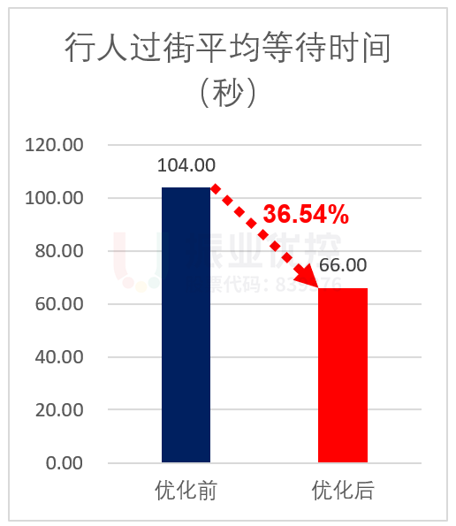 東進(jìn)口北往南行人過街等待時(shí)間由104秒降低到66秒,行人過街等待時(shí)間降低了36.54%。