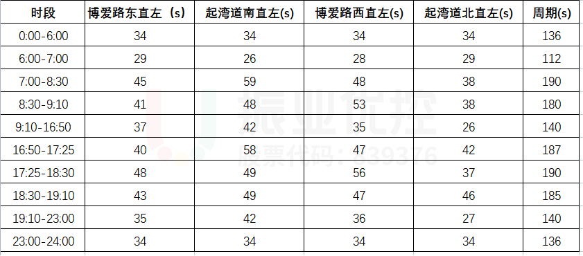 針對(duì)早、晚高峰期交叉口配時(shí)不合理問(wèn)題,結(jié)合現(xiàn)場(chǎng)調(diào)研及互聯(lián)網(wǎng)大數(shù)據(jù)分析,對(duì)交叉口高峰時(shí)段、配時(shí)進(jìn)行精細(xì)化調(diào)整,壓縮交叉口周期,減少機(jī)動(dòng)車等待時(shí)間,降低交叉口延誤指數(shù)(如下表所示)。同時(shí)對(duì)上一相位的尾車與下一相位的頭車進(jìn)行分析,確保每個(gè)方向精確到秒地設(shè)計(jì)安全過(guò)渡時(shí)間,保障待行區(qū)的安全性。