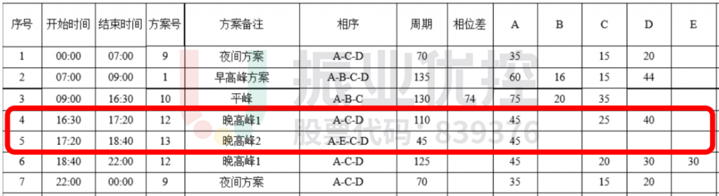 根據(jù)路口不同時(shí)段流量,精細(xì)化設(shè)計(jì)晚高峰方案。晚高峰時(shí)段,根據(jù)附近車流通行需求的變化情況,對時(shí)段進(jìn)行分割。分別在16:30-17:20、17:20-18:40各設(shè)一套方案,以應(yīng)對需求的變化。