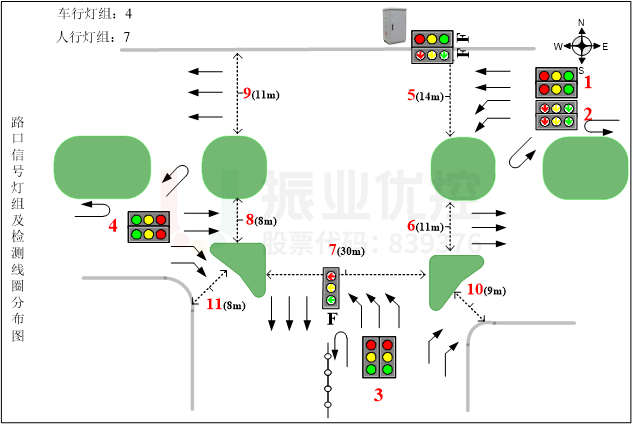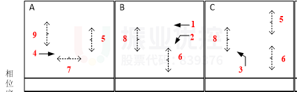(3)E-F相位:有效解決西直行排隊(duì)長(zhǎng)相互阻擋、車(chē)流離散的問(wèn)題。如下圖所示: