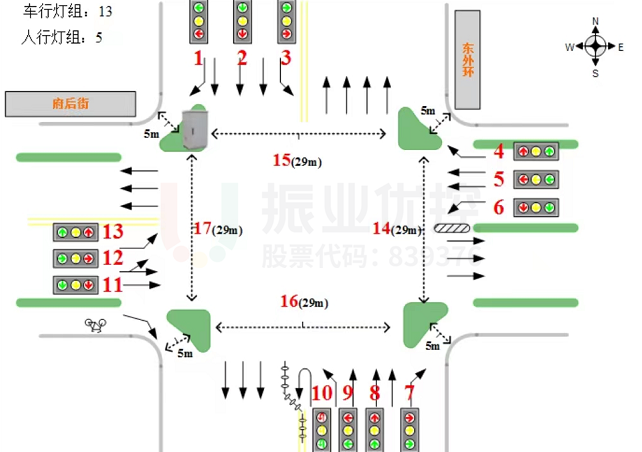 (5)由于南北進口斑馬線均有29m,為保障行人過街時間,東、西進口放行時間無法壓縮。