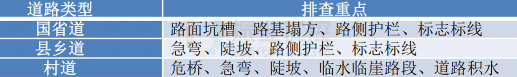 根據(jù)道路類型不同,排查內(nèi)容各有側(cè)重。一是按其占公路路網(wǎng)地位劃分為國省道、縣鄉(xiāng)道、村道。
