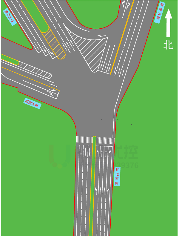 案例路口為某市高速出入口路口,南北向?yàn)槭〉?,往北進(jìn)入高速,往南返回市區(qū)。西向?yàn)橥ㄍ鞅毕虻姆种?,且由于西?cè)出口目前為施工占道狀態(tài),故西進(jìn)口占用一車道作為出口道使用。日常南北車流量、西北左轉(zhuǎn)往北車流量均較大,南往西北非機(jī)動車較多。