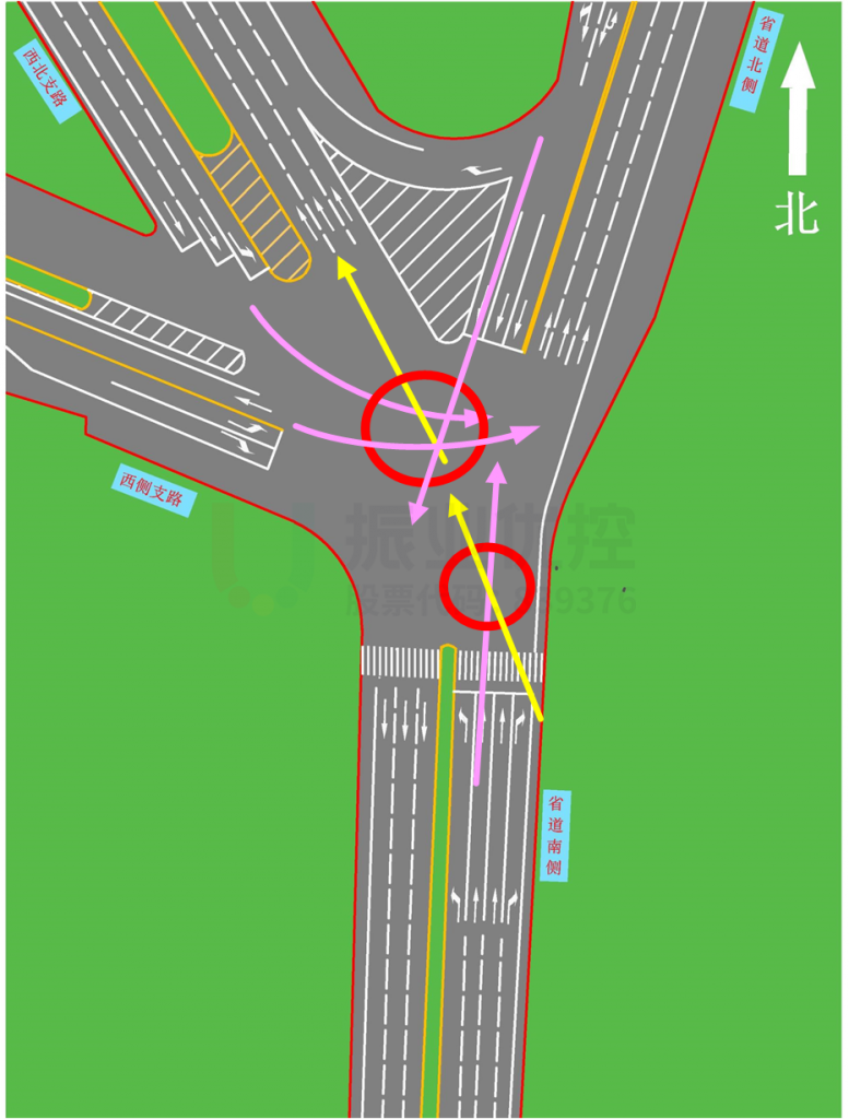 由于路口未修建信號燈,過往車輛爭搶通行。特別是西北進(jìn)口左轉(zhuǎn)至北出口,即西北往北側(cè)進(jìn)入省道方向車流量較大,稍有不慎,即會發(fā)生交通事故。
