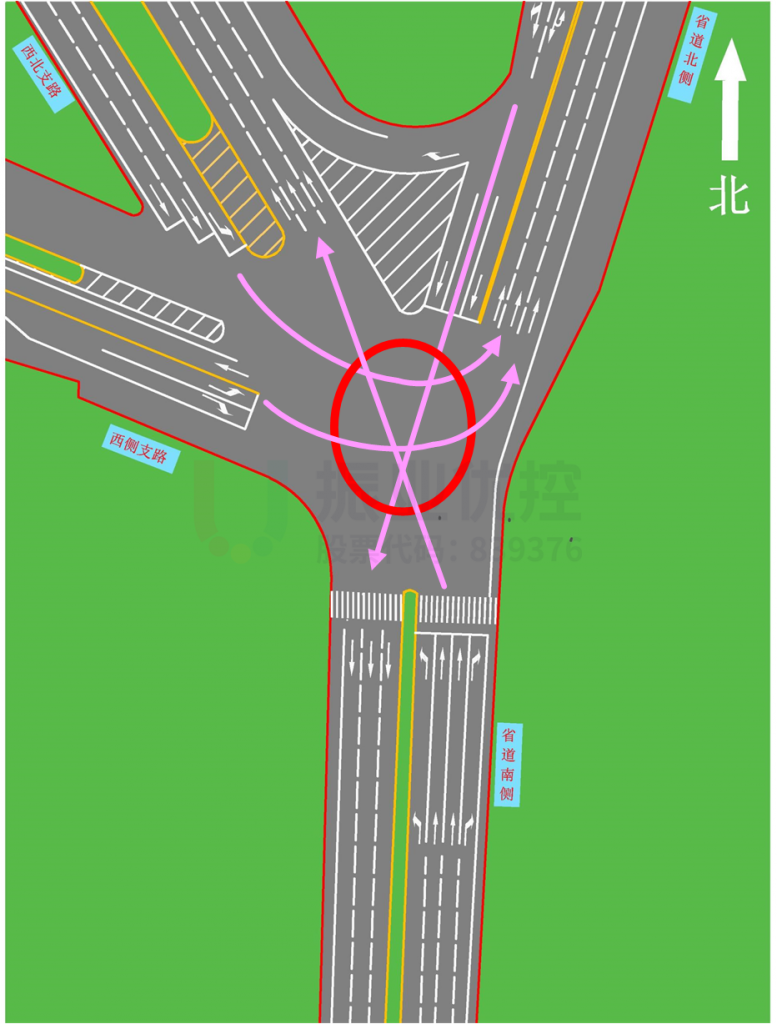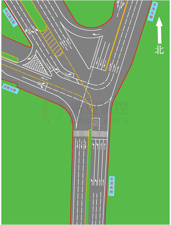 渠化方案:禁止北往西右轉(zhuǎn)方向車流,該車流需經(jīng)右轉(zhuǎn)渠化前往西北出口掉頭后右轉(zhuǎn),繞行進(jìn)入西出口;禁止西左轉(zhuǎn)往北出口方向車流,該車流需提前繞行;增加南進(jìn)口非機(jī)動車左轉(zhuǎn)待行區(qū),跟隨左轉(zhuǎn)機(jī)動車燈通行;增加西北進(jìn)口非機(jī)動車左轉(zhuǎn)待行區(qū);調(diào)整車道功能,增加相應(yīng)交通標(biāo)志。