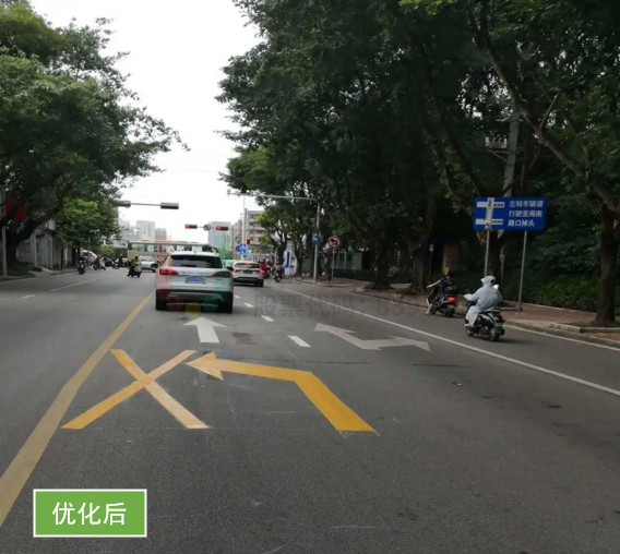 優(yōu)化效果:南進(jìn)口直行與右轉(zhuǎn)車輛通行順暢,通行效率也得到提高;南出口道標(biāo)志標(biāo)線清晰。