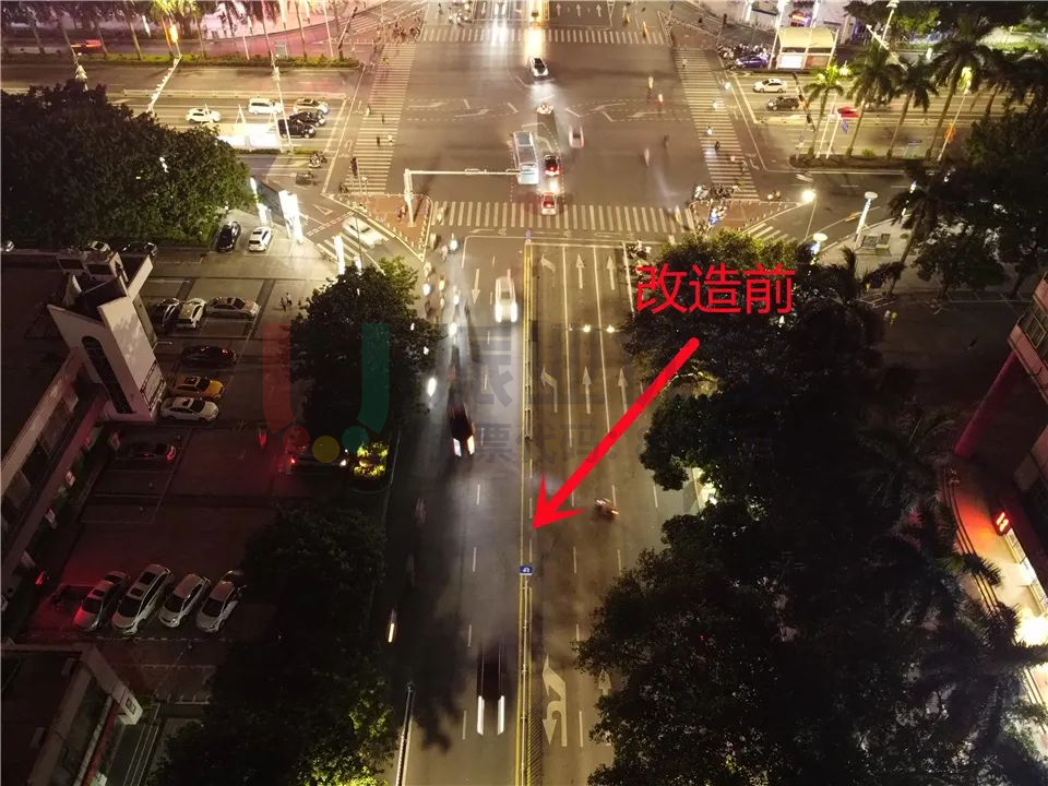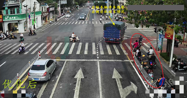 優(yōu)化效果:南進(jìn)口直行車輛不再被北進(jìn)口掉頭車輛阻擋,減少了安全隱患;北進(jìn)口右轉(zhuǎn)車輛通行更加順暢,減少了與直行非機(jī)動(dòng)車的沖突;信號(hào)燈采取自適應(yīng)控制方式,靈活調(diào)整綠燈放行時(shí)長,過去的“車看燈走”徹底轉(zhuǎn)變?yōu)楝F(xiàn)在的“燈看車放行”,信號(hào)燈控制更精準(zhǔn)、更智能。