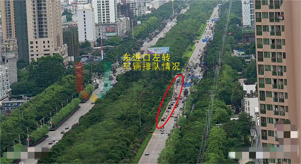優(yōu)化效果:東進(jìn)口左轉(zhuǎn)車輛長排隊(duì)情況得到緩解,同時(shí)左轉(zhuǎn)車輛不再阻擋直行車輛,有效提高了路口的通行效率。