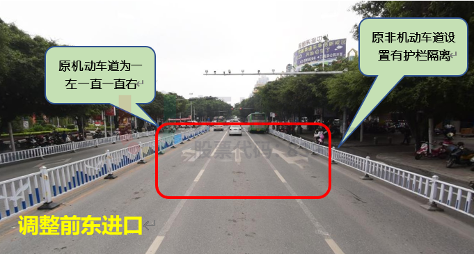 通過壓縮安全島、調(diào)整南進(jìn)口左轉(zhuǎn)車道數(shù),解決了出口道機(jī)非混行現(xiàn)象和南北左轉(zhuǎn)通行流量不對(duì)等的情況。