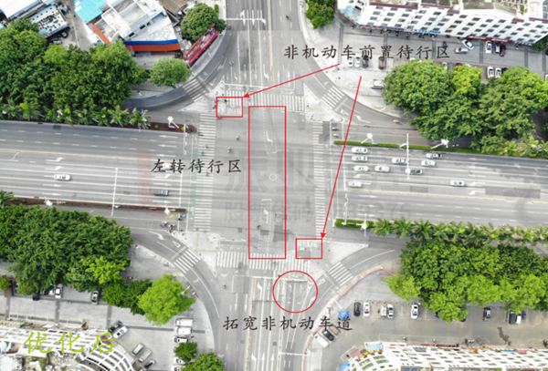 通過增加左轉(zhuǎn)待轉(zhuǎn)區(qū)與非機(jī)動(dòng)車前置待行區(qū),改善路口整體通行情況,同時(shí)消除高峰期間擁堵情況。