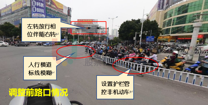 問題簡述:北進(jìn)口掉頭開口處存在行人與非機(jī)動(dòng)車穿行的情況,安全隱患較大;高峰期間北進(jìn)口車流量較大,車輛掉頭速度較慢,妨礙后續(xù)左轉(zhuǎn)車輛通行,導(dǎo)致左轉(zhuǎn)排隊(duì)長,綠燈時(shí)間未得到有效利用。