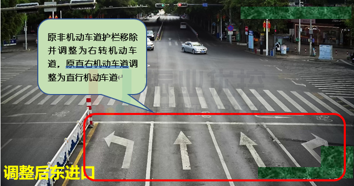 通過壓縮車道寬度增加1條左轉(zhuǎn)車道、配時(shí)優(yōu)化,有效解決高峰期間東左轉(zhuǎn)擁堵情況,提升路口整體通行效率。