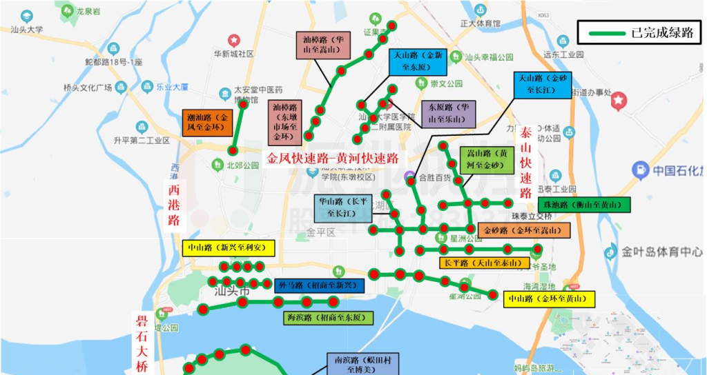 “八橫”“綠波帶”路段分別為中山路、金砂路、海濱路、長平路、珠池路、河浦大道、外馬路、南濱路;“七縱”“綠波帶”路段分別為潮汕路、汕汾路、東廈路、汕樟路、天山路、嵩山路、華山路。