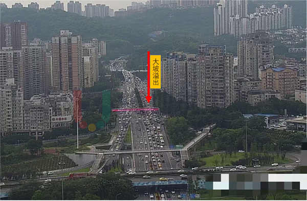 古木峰立交至大坡路口僅450米,受大流量、大坡度、大周期等因素影響,晚高峰期間大坡路口通行能力不足,導致車流回溢至人和立交,影響整個路網的通行。