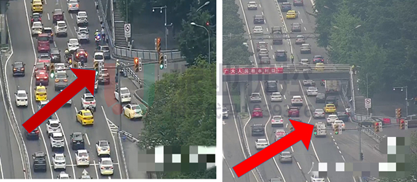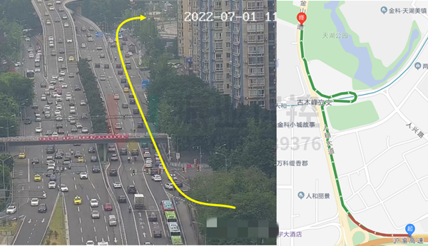 7月,人和大道晚高峰截面通過流量達5469pcu/h,同比4月的5205pcu/h,上升5.07%;最右側車道通行量平均增加了544pcu/h,增幅達44.8%,高峰消散時間提前10分鐘左右;高峰內環(huán)下道口紅綠燈綠信比由0.31提高至0.51,提升64.5%,內環(huán)下道無明顯排隊現象,行程時間減少15分鐘左右。
