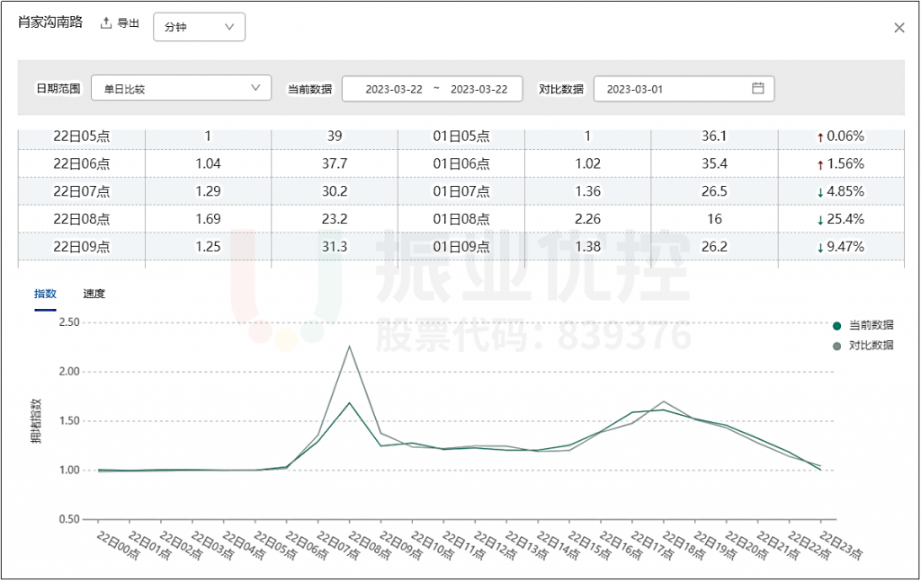 2.肖家溝南路(西往東方向)交通情況明顯好轉(zhuǎn)。根據(jù)第三方高德數(shù)據(jù),早高峰擁堵指數(shù)最值由2.26降低為1.69,降低了33.73%;最低速度由16km/h提升至23.2km/h,約提升45%。