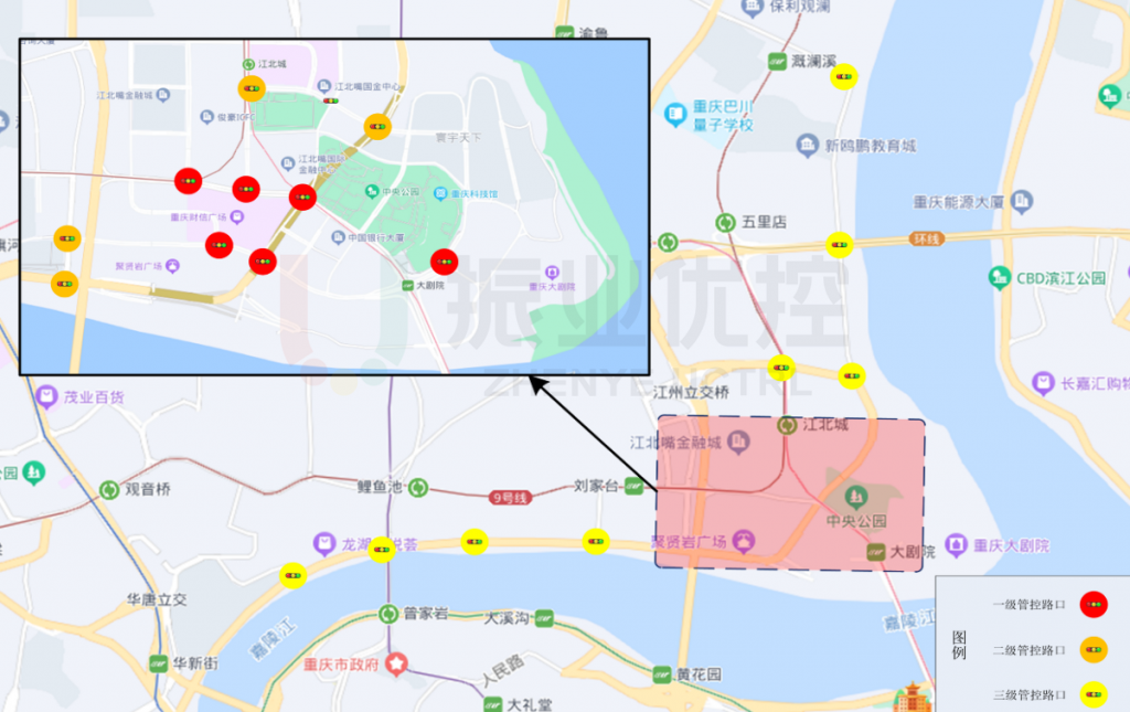 區(qū)域內(nèi)停車位緊張或流量接近飽和時(shí),啟動(dòng)微循環(huán)交通組織方式,禁止車流進(jìn)入千廝門大橋等區(qū)域,在北濱一路節(jié)點(diǎn)路口進(jìn)行臨時(shí)管控,通過渝魯大道快速疏散,緩解內(nèi)部車流壓力。