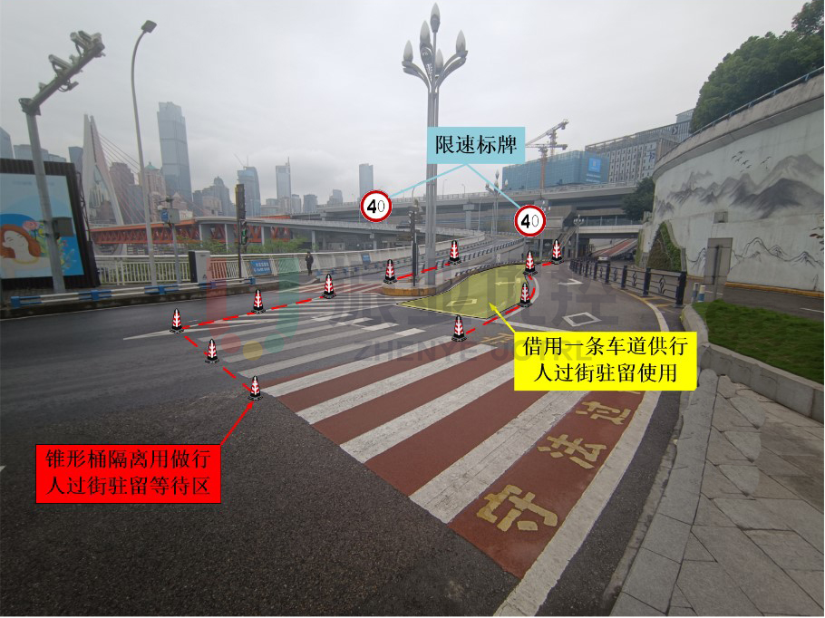 千廝門大橋北橋頭作為江邊觀景人流主要集散點(diǎn),行人通行需求較為突出,本次借用車道供行人通行,提升游客過街安全,也為游客乘坐軌道交通提供便利,實(shí)現(xiàn)了人車分離,突出了重慶交警人性化和科學(xué)化交通管理,展示了“火鍋城市”的熱情。