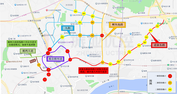 一是外環(huán)小苑路路口,分層控制,減緩車流涌入內(nèi)環(huán)。二是建新東路多路口分段式截流,均衡路段整體通行壓力。三是觀鴻大道信控配時(shí)方案采取少進(jìn)多出的通道模式,確保觀音橋環(huán)道內(nèi)部車流快速清空。四是節(jié)點(diǎn)陽光城路口預(yù)設(shè)多種控制模式,根據(jù)觀音橋東環(huán)道車流蓄積情況靈活調(diào)整。