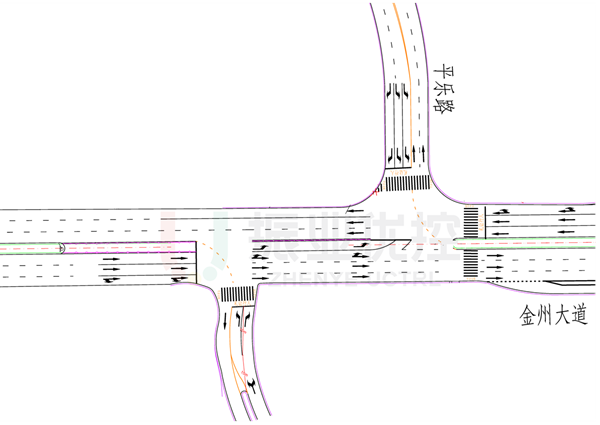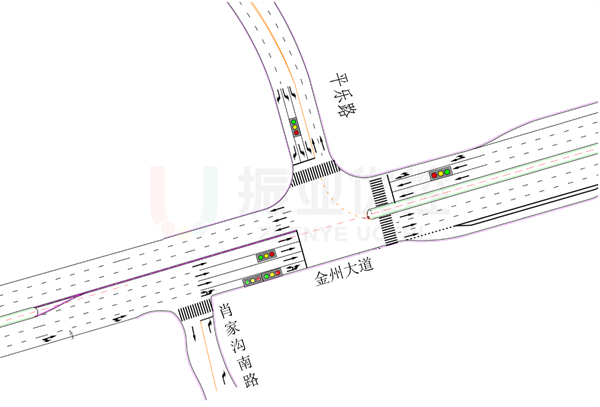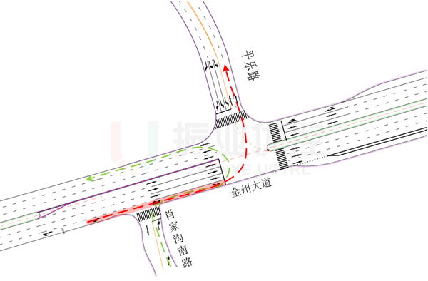 一是打開金州大道-肖家溝南路路口左轉(zhuǎn)流向,滿足肖家溝南路左轉(zhuǎn)出行需求,減少車輛交織影響;二是調(diào)整車道功能,取消左轉(zhuǎn)右置并禁止在金州大道-平樂路路口處掉頭,提高左轉(zhuǎn)通行效率。