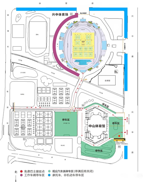 考慮到場館的交通特性,中山交警支隊對興中道、博愛路、銀通街、體育路等場館周邊道路進(jìn)行停車管制,禁停一切車輛,且活動前兩日直至活動結(jié)束,場館內(nèi)部區(qū)域的停車位除工作車輛外,禁止社會機(jī)動車輛進(jìn)入停放。