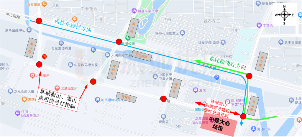 大會期間,會場周邊的珠城路(黃山路至海城路)部分路段實(shí)施交通管制,大量車流繞道行駛;另一段海城路至衡山路則啟用信號燈控制。針對珠城路通行狀態(tài)發(fā)生改變,外場保障工作組提前研判分析,對車輛繞行路線中山東路、黃山路等關(guān)鍵道路制定相應(yīng)的信號優(yōu)化預(yù)案;并對中山東路開展綠波跟車巡檢工作,確保車輛安全有序通行。