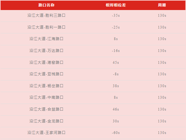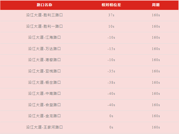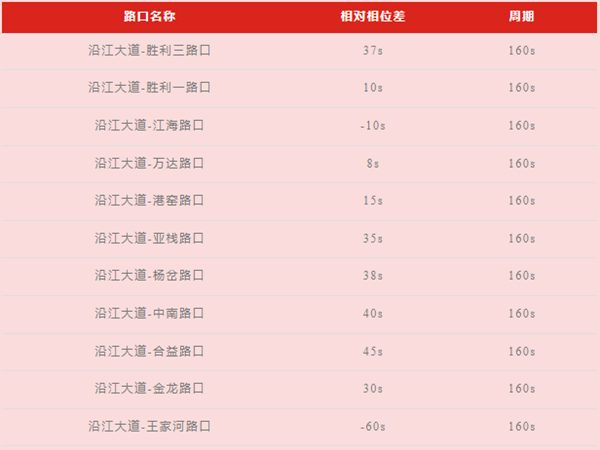 為提升路段通行效率,結(jié)合道路條件良好的情況(雙向六車道、直行對(duì)放綠信比高、道路呈東西直行、弧度小視野良好),分早高峰、平峰、晚高峰對(duì)沿江大道進(jìn)行綠波協(xié)調(diào)。