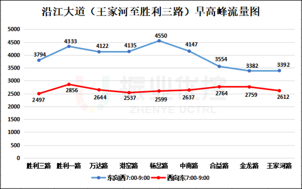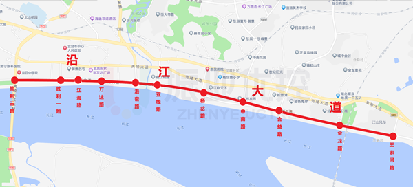 沿江大道是宜昌市東西向的城市主干道,雙向六車道,長(zhǎng)6.4公里,分布有11個(gè)T形路口,其中港窯路至勝利一路段路口間距短,平均間距僅350米。
