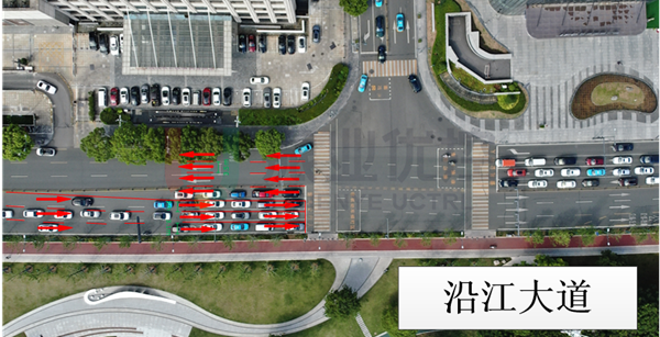 1.沿江大道-萬(wàn)達(dá)路口擁堵情況大幅緩解,東進(jìn)口直行車輛與北進(jìn)口右轉(zhuǎn)車輛各行其道,爭(zhēng)搶車道的情況基本消除,未出現(xiàn)車流回溢現(xiàn)象。