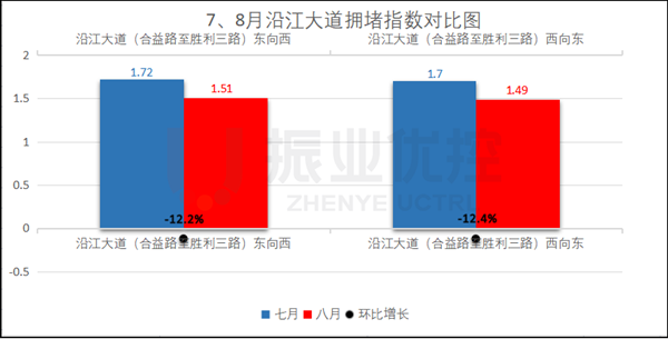 3.沿江大道擁堵指數(shù)顯著下降。環(huán)比7月沿江大道東向西進(jìn)城方向擁堵指數(shù)下降12.2%;西向東出城方向擁堵指數(shù)下降12.4%,達(dá)到了擁而不堵、快速通過(guò)、有序通行的效果。