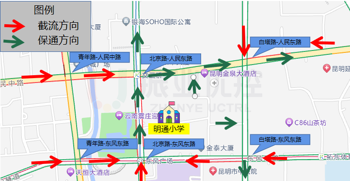 針對(duì)該學(xué)校特殊的地理位置,配時(shí)中心結(jié)合學(xué)生上學(xué)時(shí)間,提前預(yù)測(cè)堵點(diǎn),制定出“遠(yuǎn)端截流+近端疏散”的保障方案。以學(xué)校為中心,保障北京路-人民東路、北京路-東風(fēng)東路兩個(gè)路口南北向,白塔路-人民東路東西向的順暢通行,對(duì)青年路、白塔路匯流方向進(jìn)行截流。