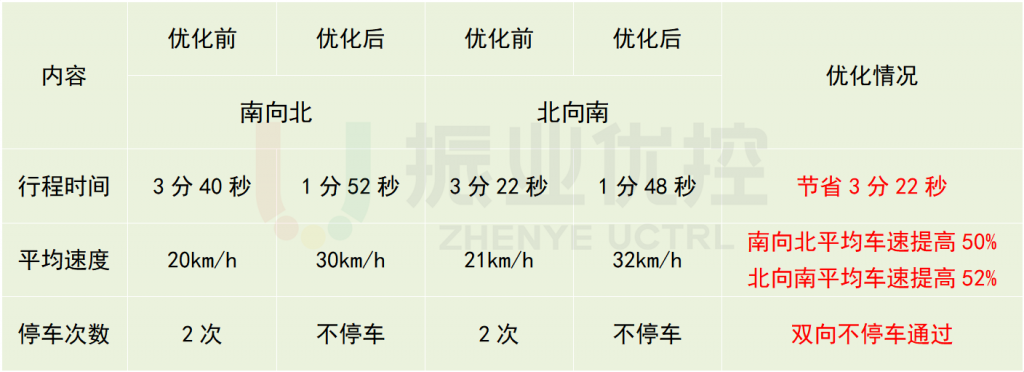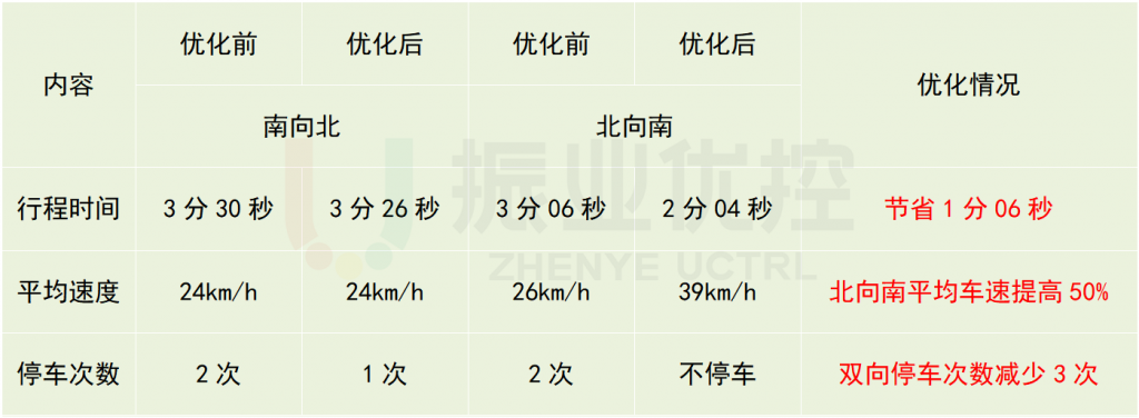 詩(shī)書路北段優(yōu)化前雙向停車4次,優(yōu)化后可雙向不停車通過(guò),優(yōu)化率100%;車輛平均行駛速度由21km/h提升至31km/h,優(yōu)化率48%。