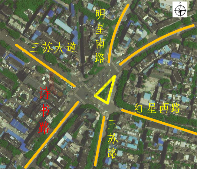 詩(shī)書路中段的鐘樓路口為七岔路口,與三蘇大道、三蘇路、紅星西路等道路相交,路口總體車流量較大。另外,由于路口地理位置特殊且交通組織條件復(fù)雜,配時(shí)優(yōu)化空間較小,難以同時(shí)與上下游路口進(jìn)行雙向綠波控制。