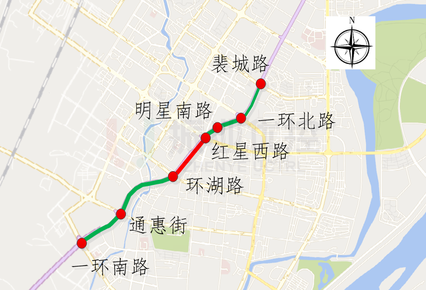 詩(shī)書路沿線路口未進(jìn)行綠波協(xié)調(diào)控制,北段(裴城路至紅星西路)雙向平均行程時(shí)間7分鐘,平均停車次數(shù)4次;南段(環(huán)湖路至一環(huán)南路)雙向平均行程時(shí)間8分鐘,平均停車次數(shù)4次;行車延誤高、通行體驗(yàn)較差。