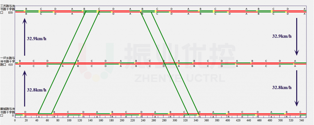 2.經(jīng)過(guò)分析計(jì)算,詩(shī)書路北段(裴城路至紅星西路)協(xié)調(diào)周期110秒,南段(環(huán)湖路至一環(huán)南路)協(xié)調(diào)周期115秒,均采用小周期控制,以下為綠波協(xié)調(diào)時(shí)距圖。