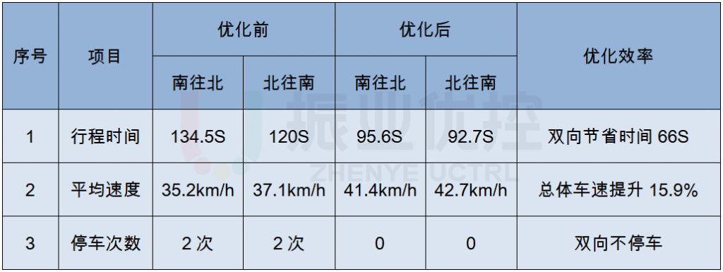 高峰期間,路段雙向行程時間由254s減少至188s,平均速度由36km/h提高到42km/h。