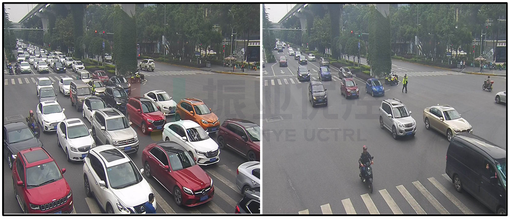 本案例中,兩江配時中心通過實地調(diào)研、測試路段情況掌握一手真實數(shù)據(jù),對金開大道鴛鴦片區(qū)路口進行相序與周期優(yōu)化調(diào)整,針對路口流量變化頻繁、間距過短造成的回溢擁堵問題,通過“自適應(yīng)控制+雙向動態(tài)綠波協(xié)調(diào)”設(shè)計,有效減少了車輛停車次數(shù),改善了路口交通環(huán)境,同時提高了路段整體車速與市民行車體驗感、舒適感。