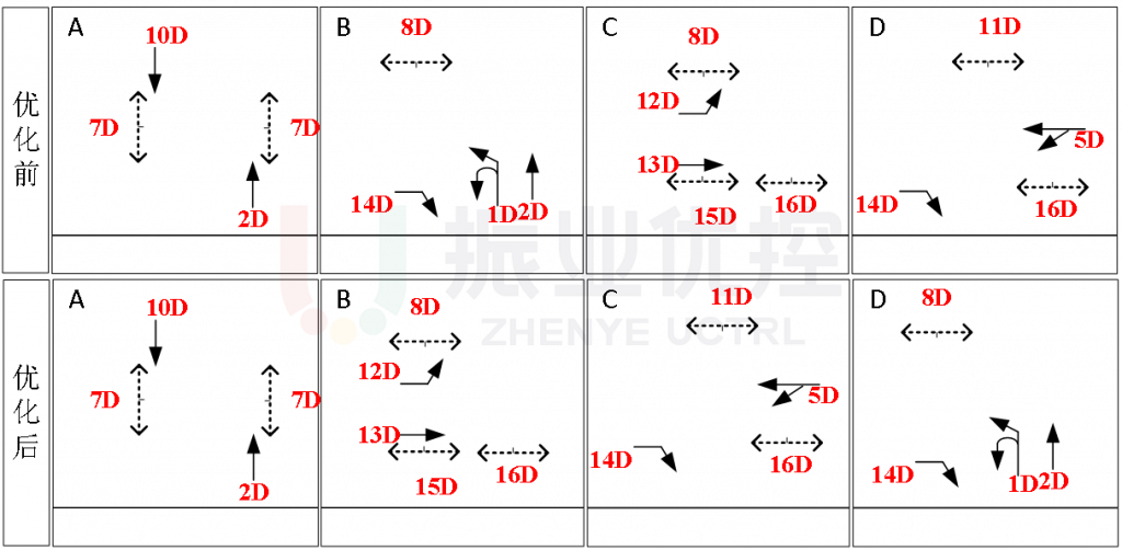 根據(jù)路段協(xié)調(diào)需求,對金開大道-鴛鴦北路、金開大道-龍帆路、金開大道-湖津支路等路口的相位相序進行調(diào)整。