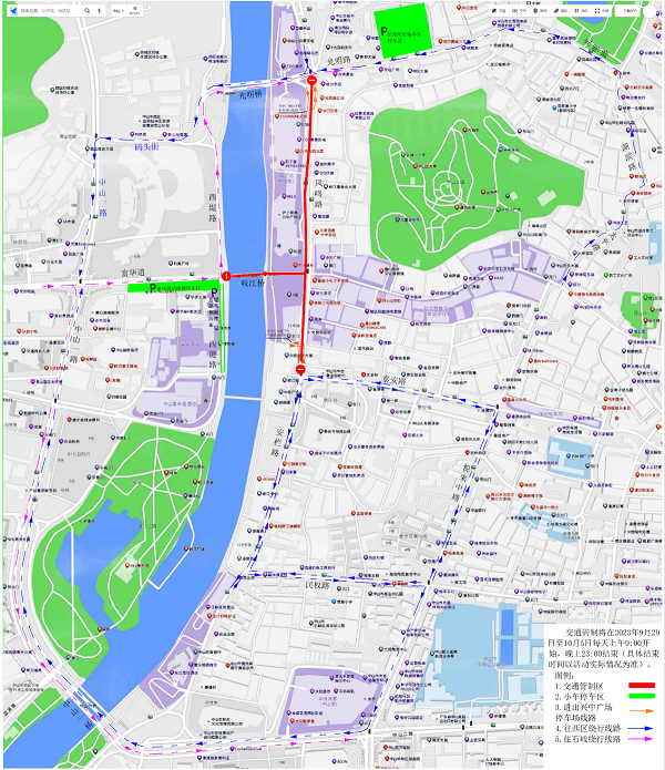 美食文化周每日上午10點(diǎn)開始,持續(xù)至晚上11點(diǎn)左右。文化周期間,上午9點(diǎn)至晚上11點(diǎn),對(duì)活動(dòng)涉及的鳳鳴路-光明路路口至南基路-泰安路路口、岐江橋?qū)嵤┙煌ü苤?,禁止社?huì)車輛通行。