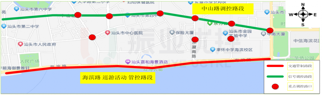 活動期間,海濱路(招商路至華僑公園)段進行臨時管控,大量車輛繞行到附近中山路、外馬路。技術(shù)團隊實時監(jiān)控繞行車流流向與重點路口運行狀況,按照交通疏導方案,對路口進行調(diào)控。