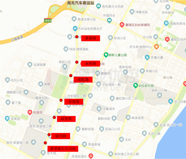 嘉南路為新建改造道路,是南充市嘉陵區(qū)南北通行的主要道路之一,全長1.9公里,分布7個路口。路段雙向8車道,設置有中央隔離護欄與非機動車道,道路條件良好,平均車速可達40km/h-50km/h。